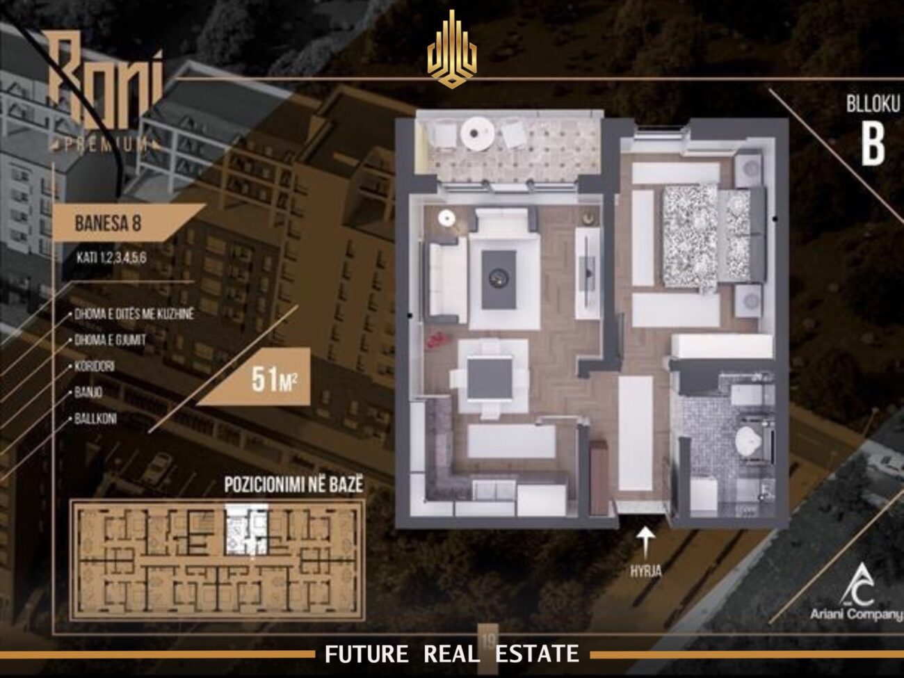 Karakterizohet me: Qëndrim ditor, 1 dhomë gjumi, banjo dhe ballkon.